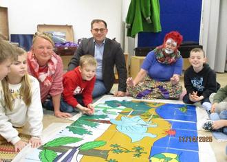 v.l.n.r.: Kinder der GS Wartmannsroth, Christine Pfaff (Bayernwerk), Bürgermeister Florian Atzmüller, Umweltclownin Ines Hansen