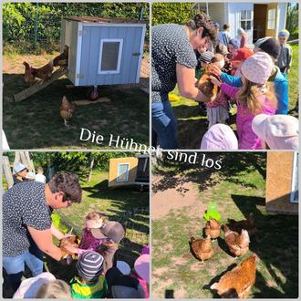 Am 19.05 war es endlich so weit, unser mobiles Hühnermobil mit fünf Hühner ist der Kita eingezogen. Mit Freude beobachteten die Kinder täglich, wie Eier gelegt wurden und die Hühner fröhlich umher gackerten. Gemeinsam mit den Kindern schauten wir verschiedenen Bücher zum Thema Huhn an, wir bastelten lustige Hühner und machten so einige Fingerspiele hierzu. Es waren aufregende zwei Wochen, in denen wir die Hühner zu Besuchen hatten.