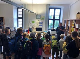 Herr Koch lernte uns wie wir uns verhalten sollen, wenn wir unsere Eltern in einer Menschenmenge verlieren. Danach beantwortete er weitere viele Fragen, wie z.B. „Was bekommen die Gefangenen zu essen?“, „Wie werden Fingerabdrücke abgenommen?“ und „Wie viele Einsatzfahrzeuge hat die Polizeiinspektion Hammelburg?“.