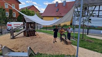 Die Freiwillige Feuerwehr sponserte das neue Sonnensegel am Völkschlärer Spielplatz. Hierzu haben sich wieder fleißige Helfer gefunden um die Fundamente der Eisenstangen zu betonieren und das Sonnensegel aufzuhängen. Als Gemeinderat Uwe Kaiser möchte ich mich herzlichst bei der Feuerwehr Völkersleier, Metallbau Vogt, Christian und Christina Winter, Torsten Zeller, Otto Winter, Adam Gärtner, Martin Zeller und Peter Volpert bedanken. Hierzu möchte ich ein großes Lob an das ehrenamtliche Engagement aussprechen, ohne dies wären solche Aktionen nicht möglich!