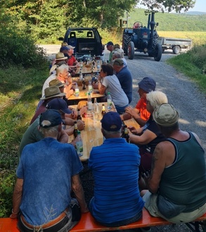 Nach diesem kurzen Zwischenstopp war es nur noch ein kurzes Stück bis ins Feuerwehrhaus. Dort standen bereits kühle Getränke, Kaffee, Kuchen und leckere Knobeline mit Sauerkraut zur Stärkung bereit. Ein herzliches Dankeschön an das Feuerwehrhaus-Team mit Uwe Schumm, Tobias Schneider und Jürgen Schühler für die Bewirtung. Danke auch an Hans Neumann für die Getränke- und Brotspende und an die Maschinisten Rudolf Wagner und Heinz Iten, die in gewohnter Weise den LANZ-Schlepper fuhren.