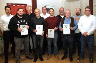 Stehend von links: 1. Vorsitzender Philipp Knauer, Matthias Mosch (25 Jahre), Peter Reinsch (Ernennung zum Ehrenmitglied), Dieter Mönch (60 Jahre), Dieter Freitag (50 Jahre), Christian Sinne (25 Jahre), Bernd Faber (60 Jahre), Heinz Schumann (60 Jahre), Florian Dressel (25 Jahre), 1. Vorsitzender Sebastian Gößl Nicht anwesend: Norbert Carl (70 Jahre)