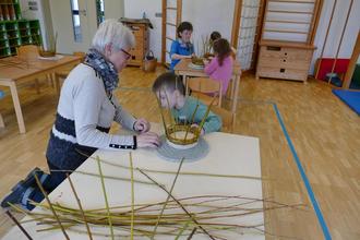 Ganz stolz präsentieren die Kinder Ihre Werke. Vorher hatten sie unter der Anleitung von Renate Engelhardt und Christine Dötschel mit viel Hingabe und Geschick ihre eigenen Körbe geflochten. „Da muss man immer so vor und zurück machen und dann immer fest nach unten drücken.“ erzählen Lotta und Lotte. In die fertigen Körbe gab es dann noch eine kleine Vorsterüberraschung aus Schokolade.