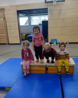 Was für ein toller Tag! Erst wird mit den neuen Eingewöhnungskindern in der Gruppe gespielt und nach dem Frühstück geht es für die verbleibenden Krippenkinder das erste Mal in die Turnhalle. Voller Staunen und Aufregung ist alleine der Weg dorthin schon ein Erlebnis - durch die Aula, vorbei an den großen Schulkindern und das Treppensteigen. In der Turnhalle angekommen gibt es kein Halten mehr für die Regenbogenwichtel. Mit viel Freude und strahlenden Gesichtern wird bei Kinderliedern gerannt, geschaukelt, gehüpft, geturnt und Ball gespielt. Nach der Corona- und Sanierungspause freuen wir uns sehr wieder regelmäßig turnen gehen zu können.