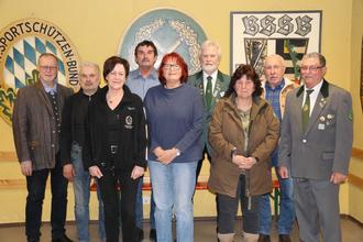 v.l.n.r. Jürgen Reuther, Gauschützenmeister Klaus Jentsch, Günther Wagner, Jürgen Rauh, Martina König-Friedrich, Uwe Pabstmann, Eveline Deller, Thomas Scheler, Petra Meier, Norbert Deller, 1. Vorstand Günther Knauer