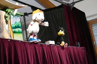 Beim Besuch des Puppentheater vom Rabenberg spielten diese eine Geschichte vom Raben Socke und seinen Freunden Eddi Bär, Schaf Wolle und Schwein Stulle. Hier ging es um ein Wettrennen bei dem die Belohnung ein leckerer Lolly war. Am Ende schafft es keiner der Freunde über die Ziellinie. So beschlossen sie, dass sie sich den Lolly einfach teilen. So ist eben Freundschaft.