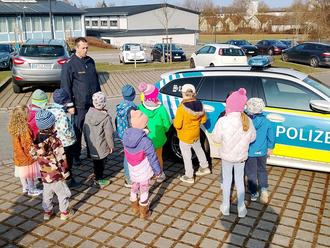 Danach blieb uns dann auch noch Zeit das Polizeiauto genauer anzuschauen. Dabei haben wir die wichtigen Gegenstände benannt und deren Aufgabe besprochen. Natürlich durfte das Testen des Blaulichts und des Martinshorns nicht fehlen.