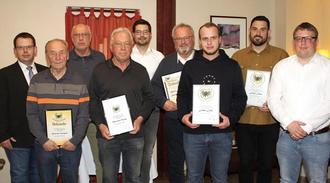 Stehend von links: 2. Bürgermeister Michael Hofmann, Heinrich Wagner (70 Jahre), Jochen Busse (Ernennung zum Ehrenmitglied), Manfred Völkl (60 Jahre), Vorstand Philipp Knauer, Bernd Faber (Ernennung zum Ehrenmitglied), Julian Lang (25 Jahre), Lukas Faber (25 Jahre), Vorstand Sebastian Gößl