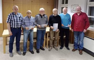 Von links: 2. Vorstand Ulrich Brehm, Hubert Gick, Herbert Janson, Helmut Knorr, Herbert Bauer, 1. Vorstand Siegfried Wendel