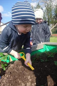 Gemeinsam wurden Löcher gebuddelt, kleine Erdbeerpflanzen eingesetzt und natürlich auch kräftig angegossen. Die Krippenkinder haben sich sehr gefreut endlich die ersten Pflanzen in unsere Hochbeete setzen zu können.
