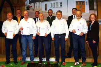 Die Geehrten des GSV „Liederkranz“ Trübenbach (vorne v. li.) Ulrich Brehm, Siegfried Wendel, Klaus-Jürgen Tapfer, Norbert Tilgner, Siegfried Bauer und Kreischorleiterin Pia Hempfling, (hinten) Martin Langbein, Sebastian Straubel, Markus Mönch, Jens-Uwe Peter