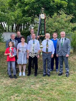 (von links vorne: Julius Wagner, Annett Dedinski, Matthias Graf, Helmut Schindler, 2. Vorstand Jürgen Erlmann, hinten: 1. Vorstand Günther Knauer, 1. Bgm. Markus Mönch, Fahnenträger Joachim Reinhardt, 2. Bgm. Michael Hofmann)