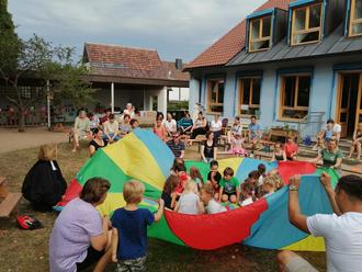 Nachdem sie ihren Schlafplatz im Turnraum eingerichtet hatten, warteten lustige Spiele und eine „Wanderung“ zum Speilplatz auf die Kids. Die Kinderdisco im Anschluss sorgte für gute Stimmung, bis die Jungen und Mädchen dann müde und glücklich sich unter ihre Decken kuschelten. Mit einer Geschichte vom kleinen Drachen Kokosnuss und Gutenachtliedern kehrte dann Ruhe ein. Bis zum nächsten Morgen, da waren nämlich die Eltern und Geschwister eingeladen. Bei einem leckeren Frühstück saßen alle noch einmal zusammen und Erinnerungen über die Kita-Zeit wurden ausgetauscht.