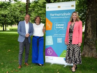 Thorsten Glauber, Staatsminister für Umwelt und Verbraucherschutz, Anna Stolz, Staatsministerin für Unterricht und Kultus, und der VerbraucherService Bayern im KDFB e.V. (VSB) freuen sich über das außergewöhnliche Engagement für Verbraucherbildung an bayerischen Schulen.