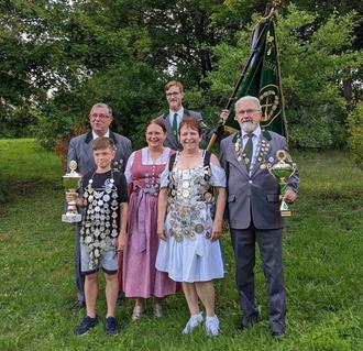 Annett Dedinski ist die neue Schützenkönigin der SSG 1888, 1.Ritterin Annette Eckardt, 2.Ritter und Gewinner des Königspokals Helmut Schindler, Jugendkönig und Pokalgewinner Finn Mryholod.