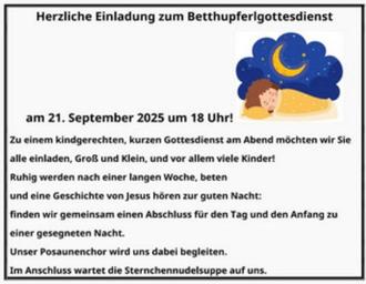| 18:00 Uhr | Betthupferl-Gottesdienst in Weidhausen |