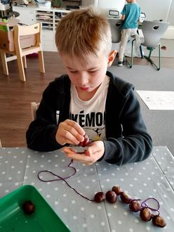 Im Garten kosteten wir die Früchte unseres Apfel- und Birnenbaums, wir sammelten Kastanien vom nahegelegenen Sportplatz und fädelten mit diesen, wunderschöne Ketten. Das Bohren hierfür war für das ein oder andere Kind ziemlich anstrengend, aber jeder hat es geschafft.