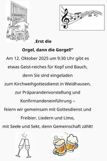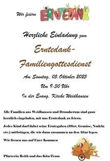 | 09:30 Uhr | Erntedank - Familiengottesdienst mit dem Kindergarten Lektorendienst: Elisabeth Schöps - Katrin Dressel - Susanne Wunder - Stefanie Lieke |