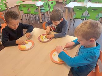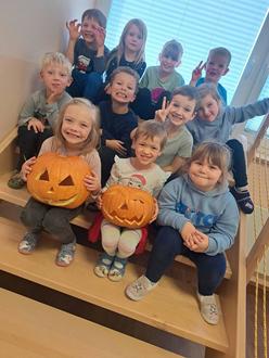 Zunächst wurde der Kürbis von den Vorschulkindern ausgehüllt. Gemeinsam haben wir das Fruchtfleisch und die Kerne herausgeholt und die restlichen Zutaten zurechtgeschnitten. Dabei hatten die Kinder viel Spaß und lernten gleichzeitig, wie man richtig mit dem Messer umgeht. Die kleingeschnittenen Zutaten wurden dann zu einer Suppe verarbeitet, die alle Kinder beim Mittagessen einmal kosten konnten.