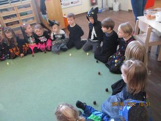 In unsere Gruppe haben wir dann allerlei veranstaltet. Wir haben gemeinsam gesungen und getanzt. Auf so einer tollen Feier, dürfen natürlich Partyspiele nicht fehlen. Wir haben Gespenster gesucht und „Dosen“ in Gespensterform abgeworfen. Eine ekelige „Gruselkiste“ gab es aus und wer sich getraut hat konnte darin so einiges ertasten. Das Highlight war das Schokokusswettessen und so ging ein wirklich toller Tag zu Ende.