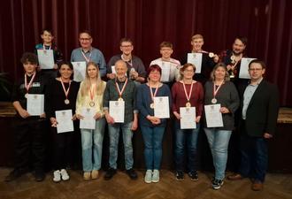 auf dem Bild die Siegerinnen und Sieger der Ortsmeisterschaft 2025 mit Vorsitzendem Michael Hofmann (unten rechts)