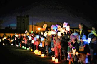 Während dessen warteten schon die Eltern am Schützenplatz bei Glühwein und Laugengebäck, welches von fleißige Helfern aus dem Elternbeirat angeboten wurde. Welch stimmungsvolles Bild bot der Laternenumzug der Kinder als sie über den Schloßplatz kamen und sich dann fürs Martinsspiel auf dem Schützenplatz einfanden. Dort sorgte der Posaunenchor für eine festliche Musikuntermalung. Alle Besucher hörten und sahen die Legende vom Heiligen Martin und Pfarrerin Reith rahmte die kleine Andacht mit Gebeten und Segen. Zum Schluss bekamen die Kinder noch die traditionellen Martinswecken und bei Punsch und Gebäck ließen alle die kleine Martinsfeier ausklingen.