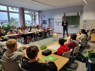 Im Rahmen des Heimat- und Sachunterrichts der Kombi-Klassen 3/4 a,b,c zum Thema „Gemeinde und Wahl“ besuchte uns der Bürgermeister Markus Mönch am 27.10.2023 im Unterricht. In der Vorstunde überlegten sich die Kinder Fragen, die sie zum Thema Gemeinde und Bürgermeister interessierten. Diese konnten sie dem Bürgermeister persönlich stellen. Die Schülerinnen und Schüler fragten eifrig und lauschten gespannt den Antworten des Bürgermeisters. Mit einem kleinen Präsent bedankten sich die Klassensprecher der Klasse 3/4a im Namen der gesamten Dritt- und Viertklässler bei Markus Mönch.