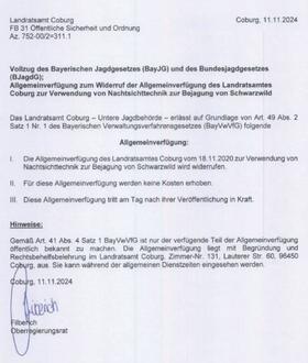 | I. | Die Allgemeinverfügung des Landratsamtes Coburg vom 18.11.2020 zur Verwendung von Nachtsichttechnik zur Bejagung von Schwarzwild wird widerrufen. |
