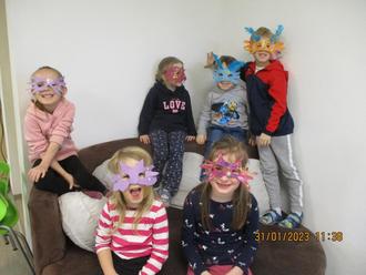 Der Fasching steht vor der Tür und wir sind schon im „Faschingsfieber“. Wir zählen schon die Tage, bis unser Kindergartenfasching endlich losgehen kann. Die Vorbereitungen laufen auf Hochtouren. Der Gruppenraum ist schon kunterbunt geschmückt mit riesigen Girlanden und Clowns die von der Decke hängen. Wie man sieht, haben wir auch schon ganz tolle Masken in der „Nami“ gebastelt. Wir stehen in den Startlöchern und es kann jetzt endlich bald losgehen.