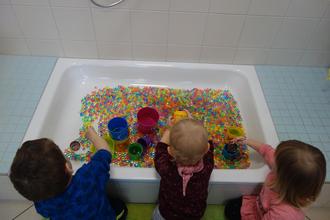 Gemeinsam wurden die Perlen mit Wasser begossen und die Kinder konnten beobachten, wie sie immer größer wurden. Als die fertigen Perlen in unser Badebecken purzelten war die Freude bei den Kindern groß. Immer in Kleingruppen durfte geschöpft, geschüttet oder einfach nur gefühlt werden. Ab und an verirrte sich auch eine Perle und musste mit feinfühligem Pinzettengriff wieder eingefangen werden. Alle hatten sehr viel Spaß und haben ganz nebenher ihre Feinmotorik trainiert.