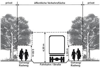 Die Gehwege und die Zugänge zur Fahrbahn und zu Gründstückseingängen müssen in einer Breite von mindestens 1,25 Metern geräumt werden. Ist in verkehrsberuhigten Bereichen kein Gehweg vorhanden, muss ein mindestens 1,50 Meter breiter Streifen vor dem eigenen Grundstück freigeräumt werden.