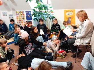 Dann machten es sich die Kinder der Klassen 3 und 4 im Vorraum der Bibliothek bequem und lauschten aufmerksam der Geschichte vom Klugscheißerchen, die einfühlsam, spannend und anschaulich von Edeltraud Höhn vorgelesen wurde.