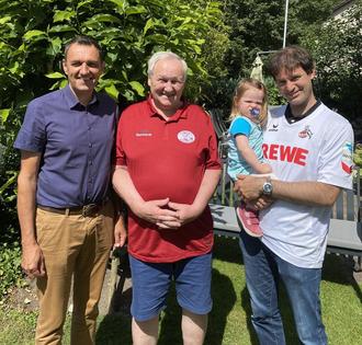 Neben Pfarrer Maaß – mit Tochter und stilecht im „Kölle-Trikot“- fand selbstverständlich auch Bürgermeister Neubauer die Zeit um unseren verdienten Mitbürger Reinhardt zu gratulieren und für die weiteren Lebensjahre alles Gute und besonders Gesundheit und Fitness zu wünschen, damit er noch lange aktiv und engagiert seinen Lebensabend genießen kann.
