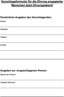 Bitte füllen Sie das Vorschlagsformular aus und lassen Sie es mit dem Betreff „Ehrung 2025“ bis zum 15. Oktober 2025 der Gemeinde zukommen: