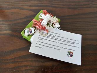 Eine Powerbank, damit alle immer genug Energie für ihre Reise haben, und ein Schlüsselanhänger, der dem Ortsschild von Weißenbrunn nachempfunden ist, mit dem Logo der Gemeinde auf der anderen Seite. Mit diesem kleinen Präsent sollen alle immer an ihre Gemeinde Weißenbrunn erinnert werden.