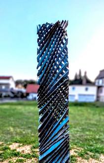 Rhythmus ist das immer wiederkehrende Thema von Künstlerin Christel Andrea Steier. Sie sägte dieses Jahr ihr Kunstwerk am HolzART-Standort Steinbach am Wald. Das filigrane Werk steht für den Lebensrhythmus. Christel Steier bearbeitete den dicken Eichenstamm mit der Motorsäge und ließ mit vertikalen und horizontalen Schnitten eine Skulptur entstehen, die im unteren Drittel starke und undurchsichtige Streben hat und nach oben hin immer feinere Lamellen erhält. Die Lamellen, so erklärte sie, sind als Töne zusehen, die Abstände als Pausen. Ihr geht es darum aus einem schweren Stück etwas Leichtes, Transparentes zu erschaffen, was ihr auch bei der diesjährigen HolzART perfekt gelungen ist. Der Vorstandsvorsitzende der Sparkasse, Harry Weiß, war von diesem Werk so begeistert, dass er es noch bei der Ergebnisausstellung für die Sparkasse erwarb.