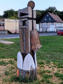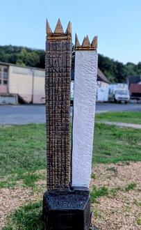 Auch Reinhard Atzl schuf zwei Skulpturen. Am HolzART Standort Weißenbrunn sägte er aus Eichenstämmen den Heiligen Sankt Martin und den Frankenkaiser Karl den Großen und dessen Frau Hildegard. Die Skulptur Heiliger Sankt Martin ist eine sehr gelungene Verbindung aus dem Heiligen Martin – angezeigt durch die Mitra, die Bischofsmütze, und den rostigen Blechflügeln der verräterischen (Martins-)Gans. Das Blech, so verriet der Künstler, lag bei ihm schon lange zu Hause und wartete auf das passende Kunstwerk. Und voilà nun zieren zwei Bleche als zerschnittener Mantel das Kunstwerk. Oder sind es doch die Flügel der Gans? Alles eine Interpretation des Betrachters! Sein zweites Werk stellt Europa in Form von zwei Stelen mit Kronen dar. Bei den „gekrönten Häuptern“ handelt es sich um den Frankenkönig Karl den Großen und seiner Frau Hildegard. Er als der großen Erneuerer, dem Bildung und Struktur wichtig waren und sie als die starke Frau an seiner Seite.