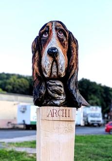 Ein weiterer besonderer „Liebling“ der Ausstellung ist Archi. Michael Alexandrov hat den Hundekopf als seine zweite Skulptur geschaffen. Archi ist der erfrischende Kontrast zu den anderen Skulpturen. Er ist weder Kaiser noch Engel, Göttin oder Fee, sondern nur ein Hund, aber mit einem teuflisch echten Bettelblick, den alle Hunde in Perfektion beherrschen. Auch diese Figur wurde aus Eichenholz gesägt und von Alexandrov handwerklich hervorragenden umgesetzt.