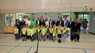 Abschließend haben die ABC-Schützen der ersten Klasse reflektierende Warnwesten von Thomas Baier (Verkehrswacht Kronach) und Christian Grebner (Direktion AOK Coburg) überreicht bekommen.