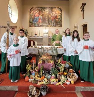 Das Bild zeigt die beiden neuen Ministranten Franka Neubauer (vorne links) und Igor Zawilinski (vorne rechts) mit Pfarrvikar Norbert Lang und weiteren Ministranten um den Erntedankaltar.