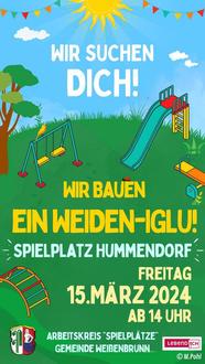 wir rufen Sie herzlich dazu auf, gemeinsam anzupacken! Am 15. März 2024 um 14 Uhr treffen wir uns auf dem Spielplatz in Hummendorf, um unter fachkundiger Begleitung von Frau Zehnter ein Weiden-Iglu zu bauen. Dieses Projekt des Arbeitskreises „Spielplätze“ bietet eine großartige Gelegenheit, unsere Gemeinschaft zu stärken und den Spielplatz in Hummendorf noch schöner zu gestalten.