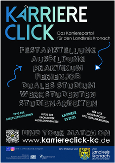 KarriereClick – Das Karriereportal für den Landkreis Kronach. Die neue, kostenlose, interaktive Plattform, bietet ein breitgefächertes Angebot an regionalen Praktika, Ausbildungsstellen und Stellenangeboten. Daher spricht KarriereClick alle Generationen unabhängig von der jeweiligen Qualifikation an und bietet aus einer Hand Informationen zur Berufsorientierung, zu Karriereevents, Ausbildungsplätzen oder Festanstellungen. Ebenso werden Praktika, Ferienjobs, Werkstudententätigkeiten oder Firmen, die Abschlussarbeiten betreuen, vermittelt.