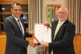 Sichtbar ergriffen nahm Egon Herrmann die Urkunde und die damit verbundene Altbürgermeisterwürde von seinem Nachfolger, dem amtierenden Bürgermeister Jörg Neubauer, entgegen.