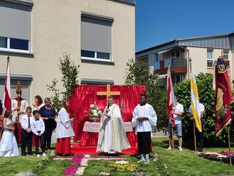 Bei der anschließenden Prozession, die von der FFW Küps begleitet und abgesichert wurde, ging es zur ersten Station am Seniorenheim Sonnenblick. Pfr. Norbert Lang sprach in einer kurzen Predigt an alle Seniorinnen und Senioren mitfühlende Worte und dankte dem Pflegepersonal für die liebenswerte Arbeit an den Bewohnern. Bei dem Segen mit dem Allerheiligsten machte er Ihnen Mut und Vertrauen zu Gott.