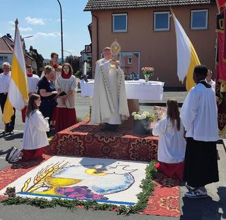Dieses Altarbild zeigt den Betrachter das symbolische Bild. Brot und Wein und den Heiligen Geist in Form einer Taube und der Kreis ist unser Planet Erde. Diese Darstellung wurde mit feinsten Quarzsand in verschiedenen bunten Farben hergestellt. Auf dem Betrachter wirkte es, wie auf den Gehweg gemalt. Gestaltet haben das kleine Kunstwerk Martina Wachter, Iris Eck, Claudia Popp und Sonja Porzelt von der Kirchengemeinde Sankt Josef Thonberg. An dieser Station wurde der Segen für die beiden Gemeinden Küps und Weißenbrunn erbeten.