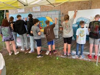 Beim Workshop „Spray out – Beyond Borders“ konnten sich die Schülerinnen und Schüler der Grund- und Mittelschule Seßlach per Graffiti-Technik mit dem Thema „Grenzen erkennen und überwinden“ auseinandersetzen und gestalterisch umsetzen. Als Leinwand dienten unter anderem auch die in die Jahre gekommenen Verkaufsstände an der Freizeitanlage am Freibad in Autenhausen, die nun im neuen Glanz erstrahlen. Initiiert hatte dieses Jugendprojekt der „Förderverein Freizeitanlage Autenhausen“.