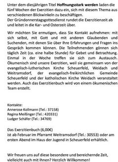 | 19.30 Uhr | Ökumenische Alltagsexerzitien "Hoffnung auf dem Prüfstand" |