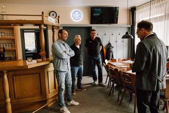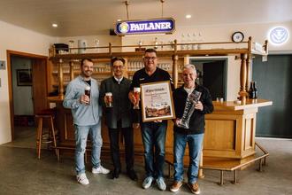 Im Bild von links: Jörg Bissot (1. Vorstand); Elmar Störcher (Gebietsverkaufsleiter Bayern-Nord der Paulaner-Brauerei-Gruppe); Steffen Eberlein (2. Vorstand); Axel Reich (3. Vorstand)