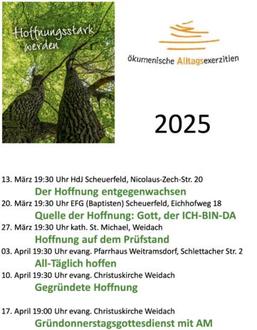 | 19.30 Uhr | Ökumenische Alltagsexerzitien "Gegründete Hoffnung" |