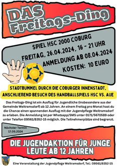 Das Freitags-Ding ist ein Ausflug für Jugendliche (insbesondere aus der Gemeinde Weitramsdorf) ab 12 Jahren. An einem Freitag pro Monat hast du die Chance einen spannenden Ausflug mit der Jugendpflege Weitramsdorf zu erleben. Die Anmeldung ist per Whatsapp/SMS unter 0171/5670589 oder unter Telefon 09561/8352-15 möglich. Die Teilnehmerplätze sind begrenzt.